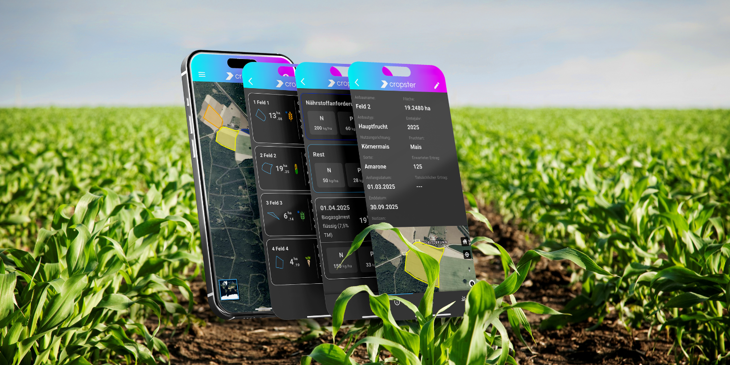 Gemeinsam mit unseren Partnern entwickeln wir Tools, die landwirtschaftliche Prozesse effizienter gestalten. Dazu gehört die Softwarelösung cropster FARM, die Landwirtinnen und Landwirte bei der Entscheidungsfindung und Dokumentation unterstützt.